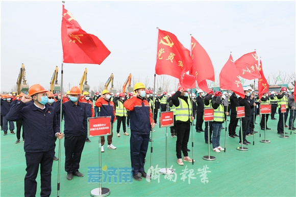 启动仪式上,武伟为城投集团2021年劳动竞赛进行动员部署,参建单位代表做表态发言。随后,与会领导向参加劳动竞赛的“党员突击队”授旗,15支“党员突击队”队员集体宣誓,吹响了加快项目建设冲锋号,掀起了工程建设新高潮。