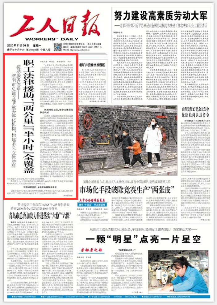 11月30日,《工人日报》头版刊登《职工法律援助,“两公里”“半小时”全覆盖》,点赞济南市总工会法律援助覆盖面、受益面不断扩大,成效明显增强。