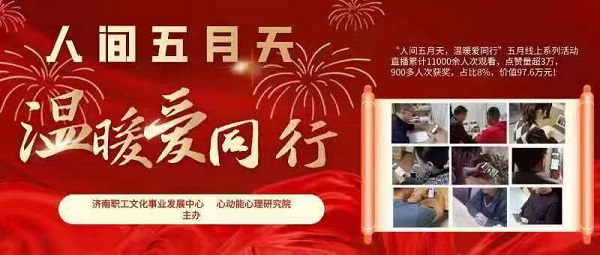 本次“人间五月天,温暖爱同行”五月线上系列活动分别于5月15日、5月20日、5月25日、6月1日举行。据统计,活动直播累计11000余人次观看,点赞量超3万,900多人次获奖,占比8%,价值97.6万元。济南市职工文化事业发展中心举办本次系列活动有利于发挥中心职工文化主阵地作用,增强每个职工家庭成员的幸福感,助力提升每位职工家庭的幸福温馨指数。