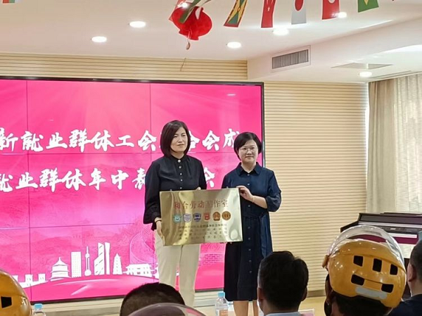 区总工会党组书记、常务副主席仇文君为大明湖街道世茂商圈新就业群体工会联合会授牌。