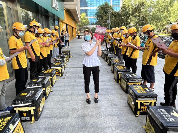 “求学圆梦行动”助学工作人员赵尊雪老师为外卖员讲解“求学圆梦”学历提升政策。