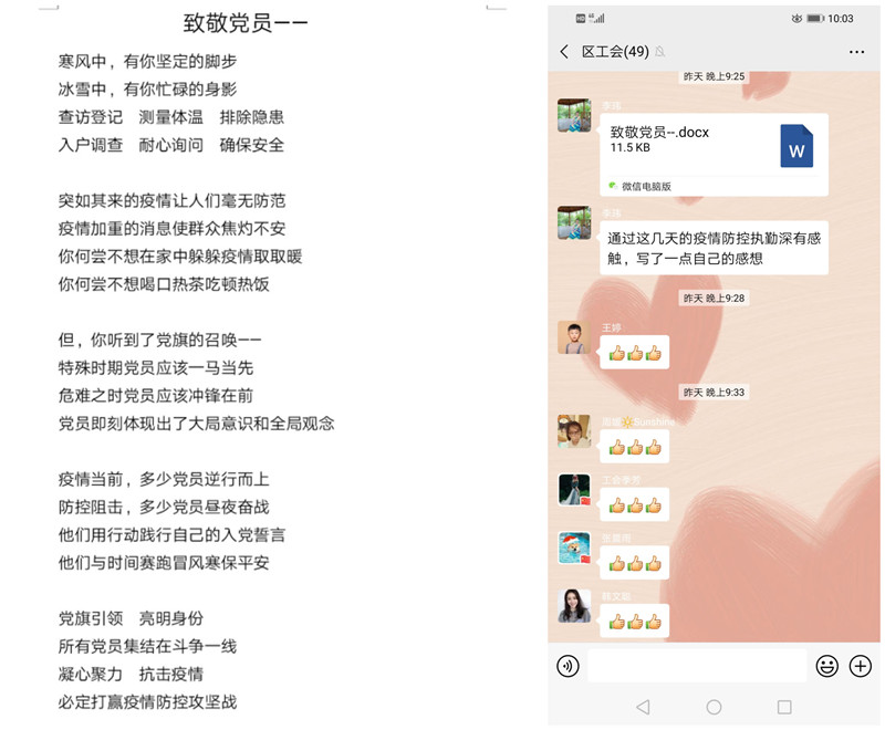 区总工会第一时间成立党员突击队,在党组书记带领下,全体党员干部坚决贯彻落实党中央决策部署,党建统领,自觉做政治责任的忠实践行者;担当使命,自觉做疫情防控的坚定奋斗者;扛起责任,自觉做正向舆论的一线工作者。全体党员不畏严寒、24小时坚守岗位,尽最大努力保证人民群众生命安全,让党旗在防控疫情斗争第一线高高飘扬。