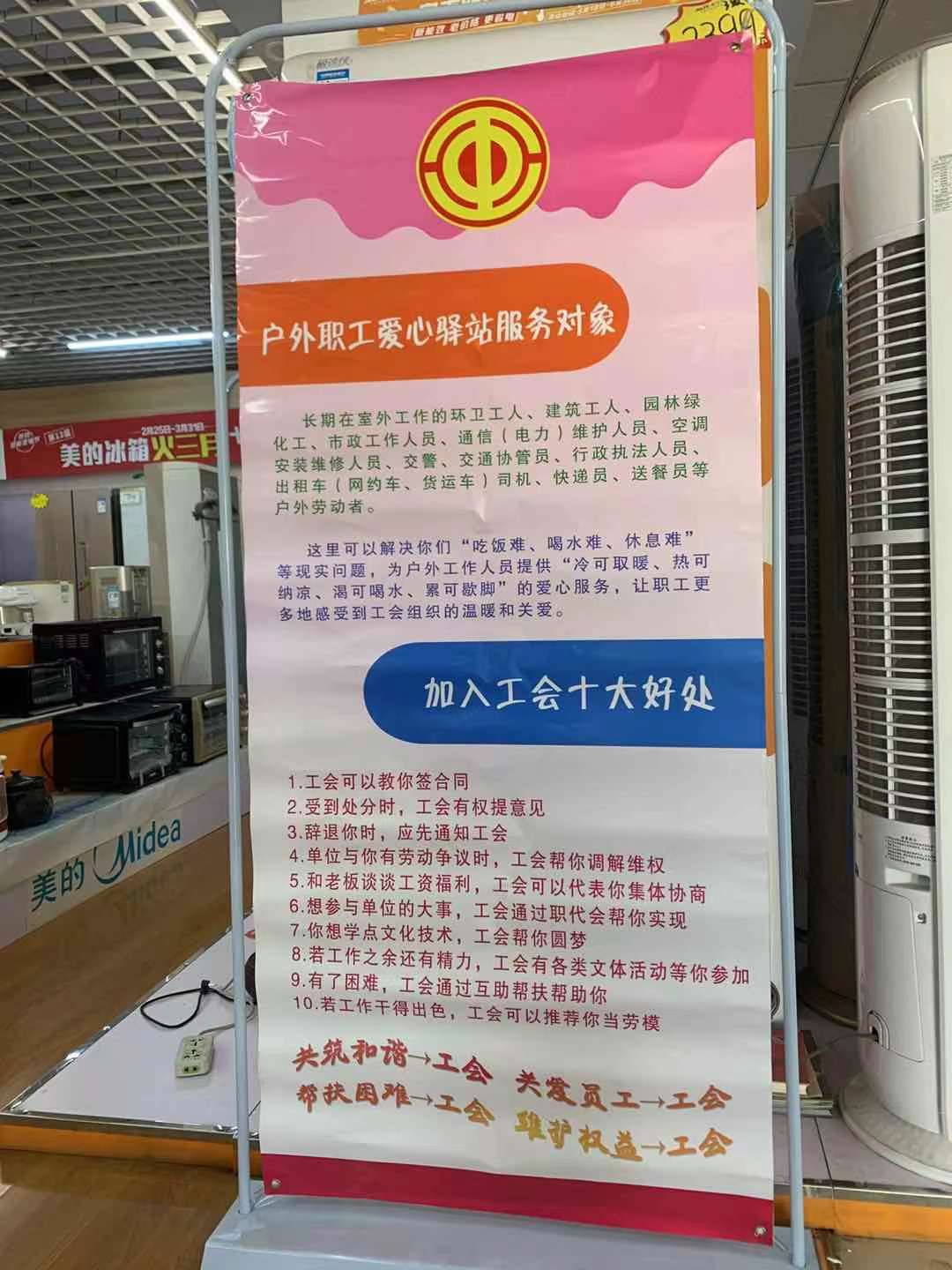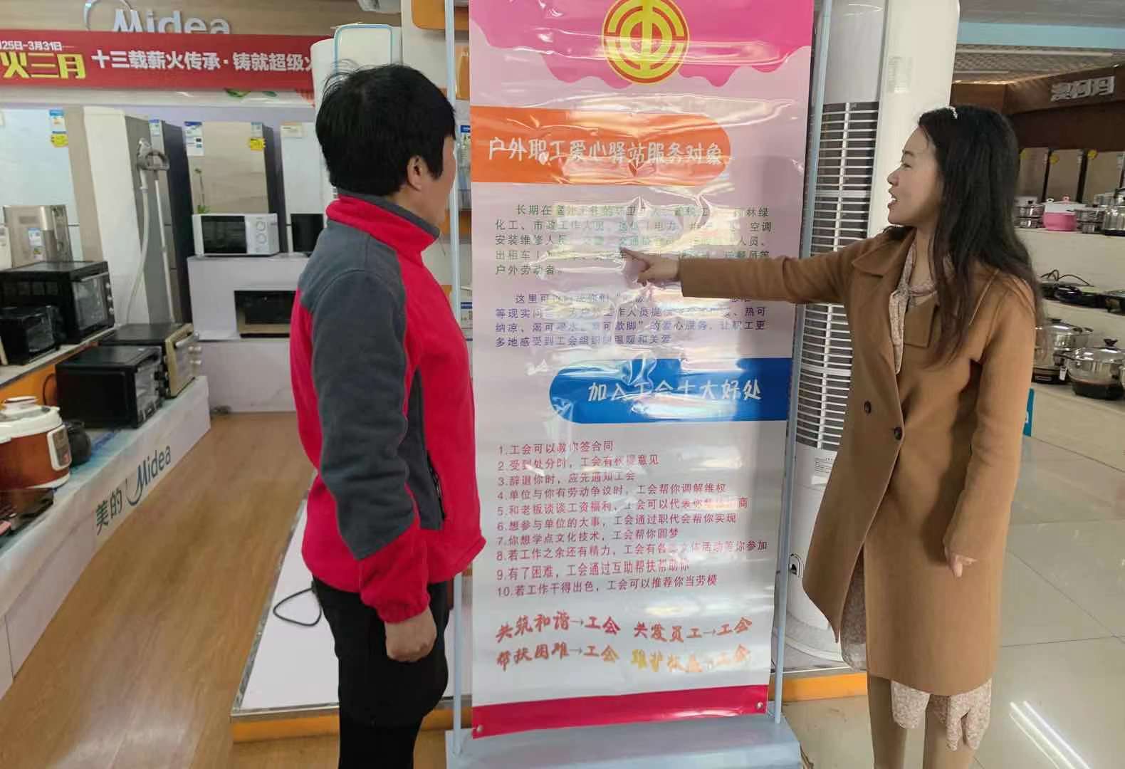 里辛街道总工会利用户外驿站宣传栏宣传“工会可以教职工签合同;受到处分时,工会有权提意见;遭遇辞退时,企业应先通知工会;单位与你有劳动争议时,工会帮你调解维权;和老板谈谈工资福利,工会可以代表你集体协商……”等加入工会的十大好处。