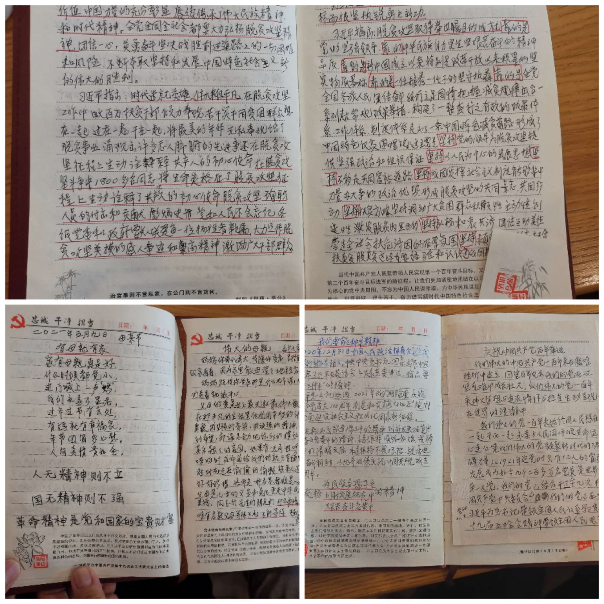 在慰问过程中,马立世与两位老党员就身体健康状况、家庭状况、生活方面进行亲切攀谈,对两位同志为工会做出的贡献表示充分肯定与由衷的赞扬。身为工会夜校教师的86岁离休党员袁训仪,时刻谨记党的教诲,不顾年事已高,仍认真学习党史,党史学习笔记写了厚厚的一本,上面工工整整地写着“人无精神则不立 国无精神则不强”,《我们要有“三种牛”的精神》《庆祝中国共产党百年诞生》等读后感,一个老党员的爱党爱国之情溢于言表。