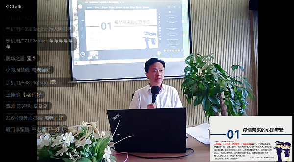 讲堂通过CCtalk网络直播的方式进行,主讲人韦志中以《筑牢心理“防火墙” 打赢疫情“攻坚战”—疫情常态化情况下的警务人员心理建设》为题,重点围绕疫情带来的心理考验,警务人员的压力特点、不良体验和应对、情绪管理等内容,结合当前民警辅警在开展疫情防控等工作中存在的自我心理认知,深入浅出地讲解了积极情绪的培育方法、家庭关系的调节艺术和职业倦怠的应对策略等心理学知识和技能。